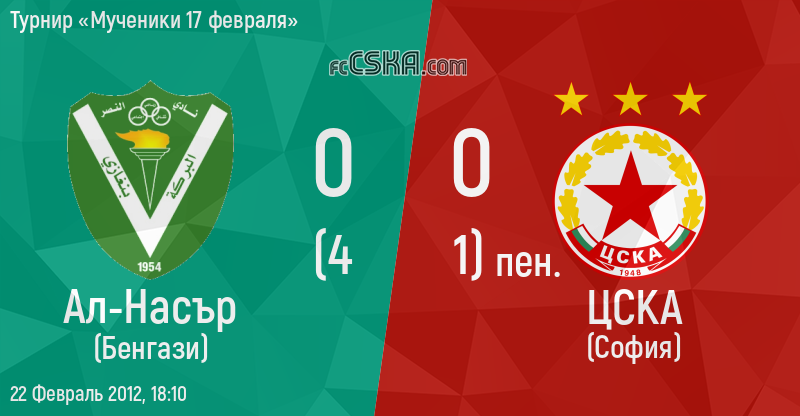 ЦСКА сыграла вничью с фк Ал-Насър (Бенгази) со счётом 0:0 в матче Турнир «Мученики 17 февраля» сыгранный 22 Февраль 2012 г. в 18:10 ч. на стадионе „Мъчениците от февруари“ в Бенгази. за армейцев отличился Станко Йовчев (46′ from penalty).