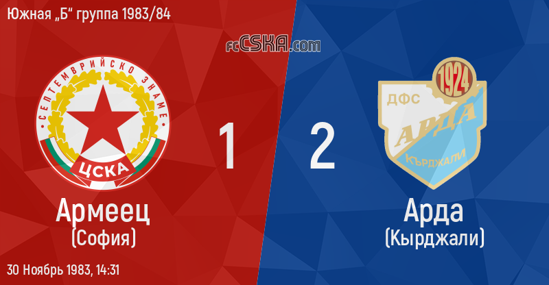Армеец Сф проиграла Арда (Кырджали) со счётом 1:2 в матче Южная „Б“ группа 1983/84 сыгранный 30 Ноябрь 1983 г. в 14:31 ч.