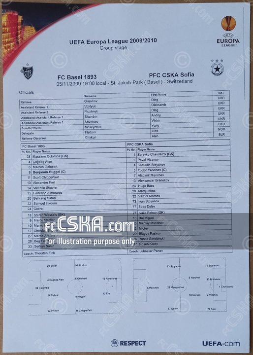 ЦСКА проиграла Базель 1893 со счётом 3:1 в матче сыгранный 5 Ноябрь 2009 г. в 19:00 ч. за армейцев отличился Тодор Янчев (61′).