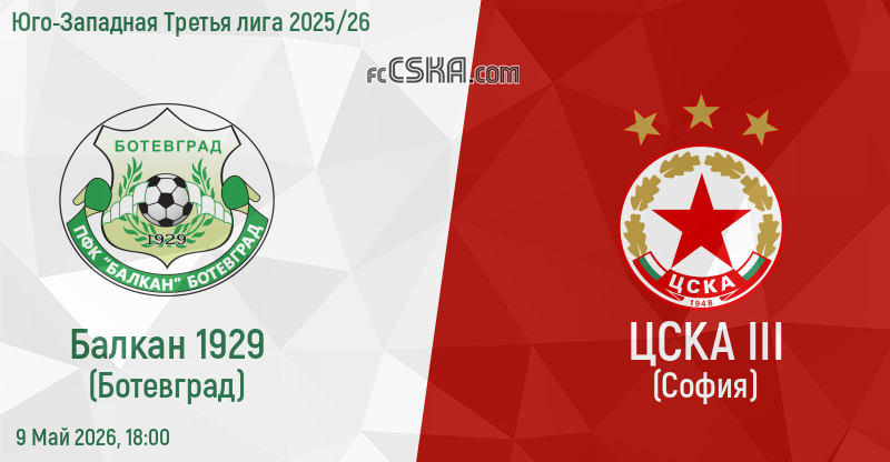 ЦСКА III​ будет играть с Балкан Бот. в матче Юго-Западная Третья лига 2025/26 9 Май 2026 г. в 18:00 ч.