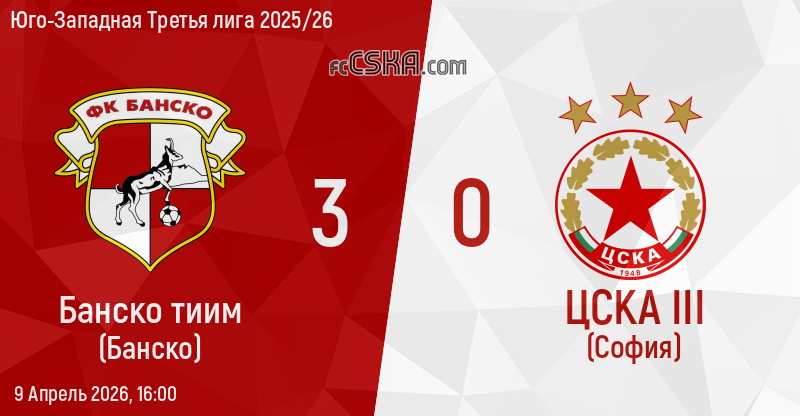 ЦСКА III проиграла Банско тиим (Банско) со счётом 3:0 в матче Юго-Западная Третья лига 2025/26 сыгранный 9 Апрель 2026 г. в 16:00 ч. на стадионе „Святой Пётр“ в Банско.