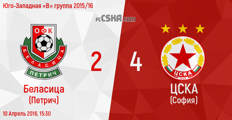 ЦСКА​ выиграл у Беласица (Петрич) со счётом 2:4 в матче Юго-Западная «В» группа 2015/16 сыгранный 10 Апрель 2016 г. в 15:30 ч. за армейцев отличились Nikolay Tsvetkov (17′, 26′ и 59′) и Александар И. Александров (65′).