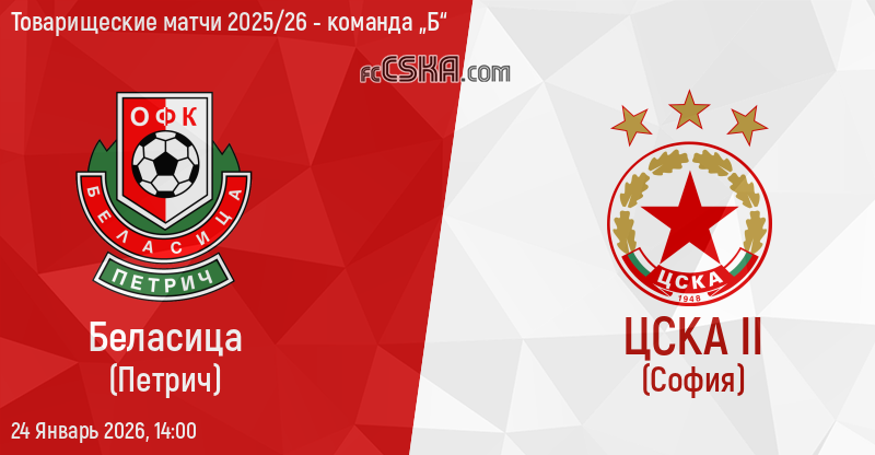 ЦСКА II сыграла вничью с фк Беласица (Петрич) со счётом 0:0 в матче Товарищеские матчи 2025/26 - команда „Б“ сыгранный 24 Январь 2026 г. в 14:00 ч. на стадионе „Спортен центыр „Юлий Тушев"“ в с. Вылково.