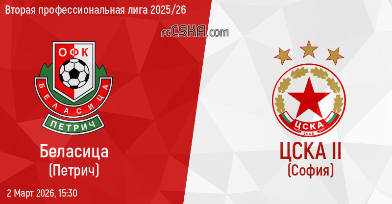 ЦСКА II будет играть с Беласица в матче Вторая профессиональная лига 2025/26 2 Март 2026 г. в 15:30 ч. на стадионе „Цар Самуил“ в Петрич.