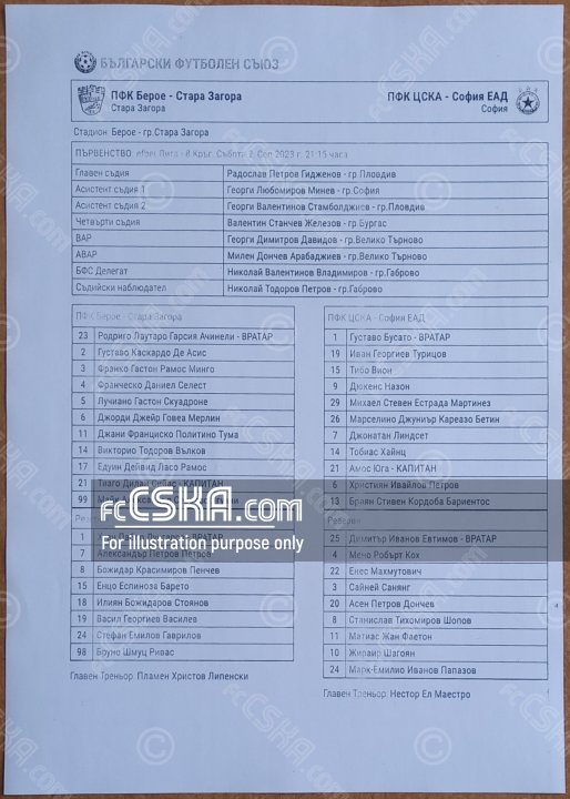 ЦСКА​ выиграл у Берое (Стара Загора) со счётом 0:3 в матче Первая профессиональная лига 2023/24 сыгранный 2 Сентябрь 2023 г. в 21:15 ч. на стадионе „Берое“ в Стара Загора. за армейцев отличились Дюкенс Назон (18′), Тобиас Хайнц (20′) и Джонатан Линдсет (63′).