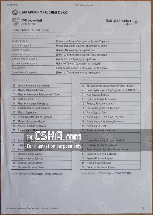ЦСКА​ сыграла вничью с фк Берое (Стара Загора) со счётом 1:1 в матче Первая профессиональная лига 2017/18 - первая шестёрка сыгранный 21 Апрель 2018 г. в 20:00 ч. на стадионе „Берое“ в Стара Загора. за армейцев отличился Stanislav Manolev (55′).