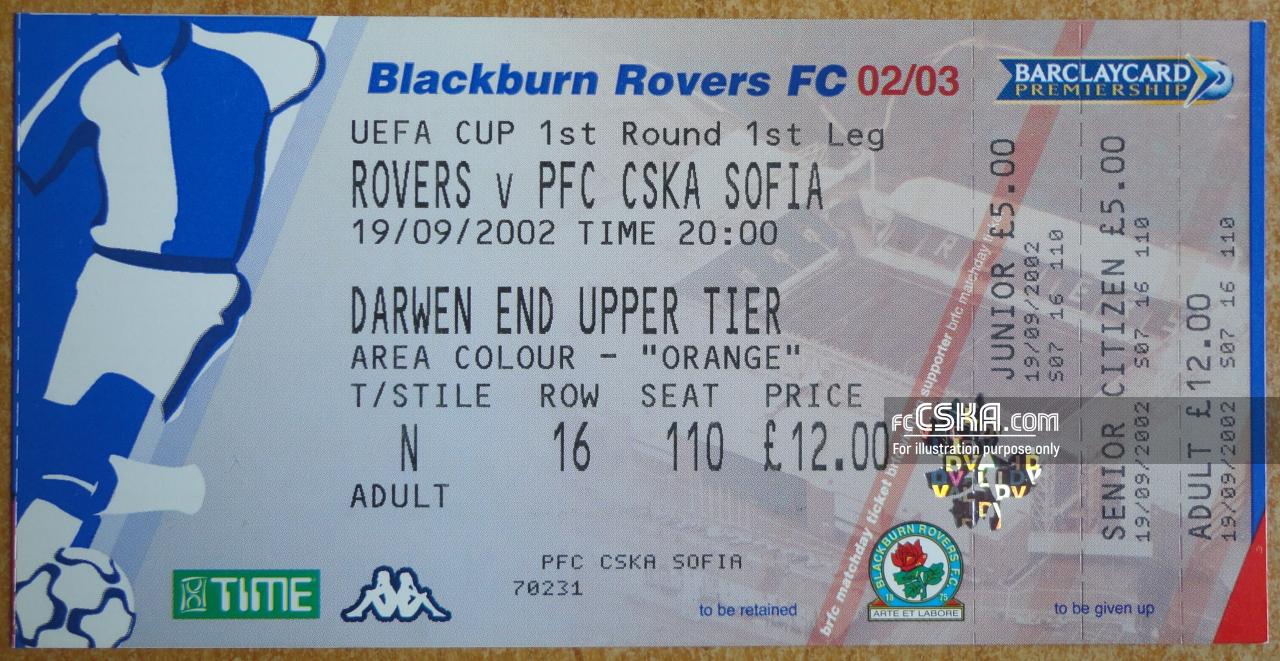 ЦСКА сыграла вничью с фк Блэкберн Роверс со счётом 1:1 в матче Кубок УЕФА 2002/03 сыгранный 19 Сентябрь 2002 г. в 22:00 ч. за армейцев отличился Velizar Dimitrov (22′).