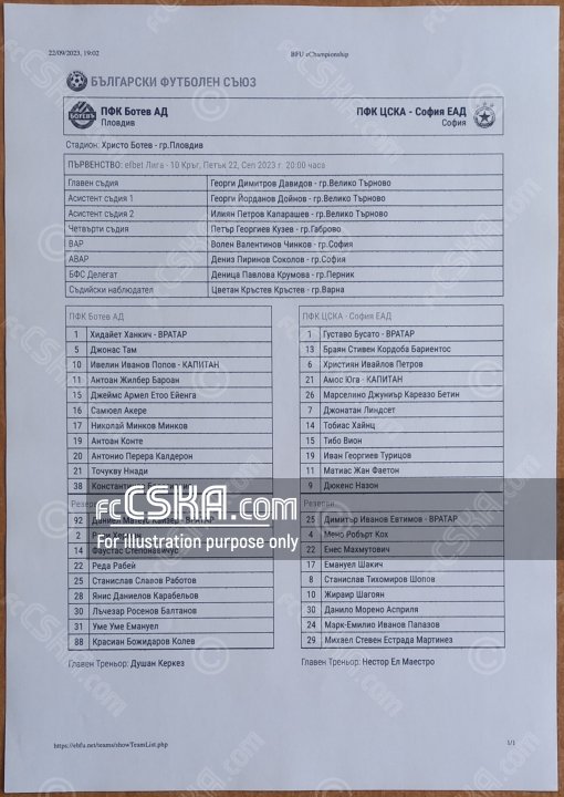 ЦСКА выиграл у Ботев (Пловдив) со счётом 1:2 в матче Первая профессиональная лига 2023/24 сыгранный 22 Сентябрь 2023 г. в 20:00 ч. на стадионе „Христо Ботев“ в Пловдив. за армейцев отличились Джонатан Линдсет (21′) и Дюкенс Назон (67′ from penalty).