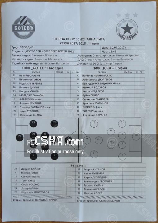 ЦСКА выиграл у Ботев (Пловдив) со счётом 2:6 в матче Первая профессиональная лига 2017/18 сыгранный 30 Июль 2017 г. в 18:45 ч. на стадионе „Ботев 1912“ в Коматево, Пловдив. за армейцев отличились Fernando Karanga (13′, 61′ from penalty и 69′), Тиаго Родригес (29′) и Кирил Десподов (84′ и 91′).
