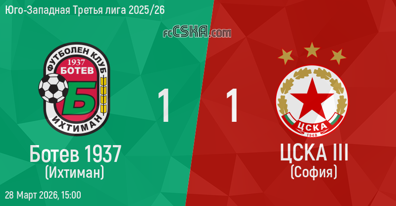 ЦСКА III​ сыграла вничью с фк Ботев 1937 (Ихтиман) со счётом 1:1 в матче Юго-Западная Третья лига 2025/26 сыгранный 28 Март 2026 г. в 15:00 ч.
