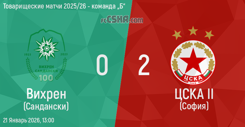 ЦСКА II выиграл у Вихрен (Сандански) со счётом 0:2 в матче Товарищеские матчи 2025/26 - команда „Б“ сыгранный 21 Январь 2026 г. в 13:00 ч. на стадионе „Спортен центыр „Юлий Тушев"“ в с. Вылково.