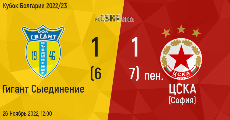 ЦСКА​ сыграла вничью с фк Гигант Сыединение со счётом 1:1 в матче Кубок Болгарии 2022/23 сыгранный 26 Ноябрь 2022 г. в 12:00 ч. на стадионе „Градски“ в Съединиение. за армейцев отличились Браян Морено (74′ и 148′ from penalty), Иван Турицов (140′ from penalty), Джонатан Линдсет (142′ from penalty), Юрген Маттей (144′ from penalty), Маурисио Гарсес Жезус (146′ from penalty), Марселино Кареасо (150′ from penalty) и Менно Кох (152′ from penalty).