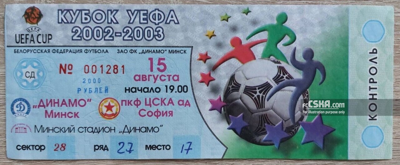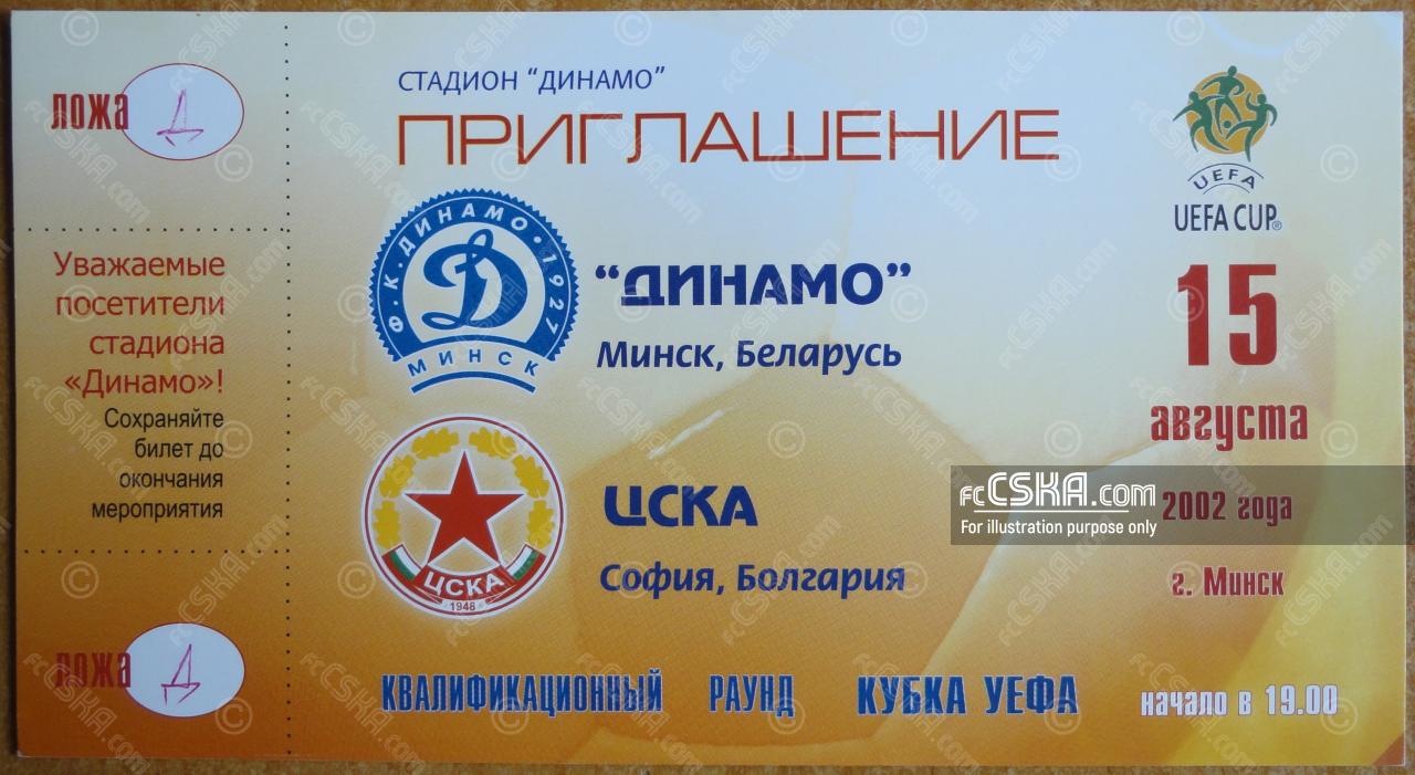 ЦСКА выиграл у Динамо (Минск) со счётом 1:4 в матче Кубок УЕФА 2002/03 сыгранный 15 Август 2002 г. в 19:00 ч. за армейцев отличились Makdonald Mukansi (18′), Velizar Dimitrov (28′ и 47′) и Жоао Брито (31′).