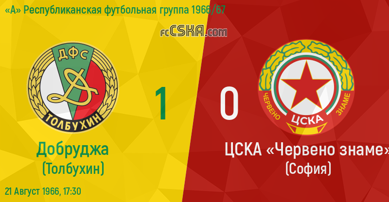 ЦСКА «Червено знаме» проиграла Добруджа (Толбухин) со счётом 1:0 в матче «А» Республиканская футбольная группа 1966/67 сыгранный 21 Август 1966 г. в 17:30 ч.
