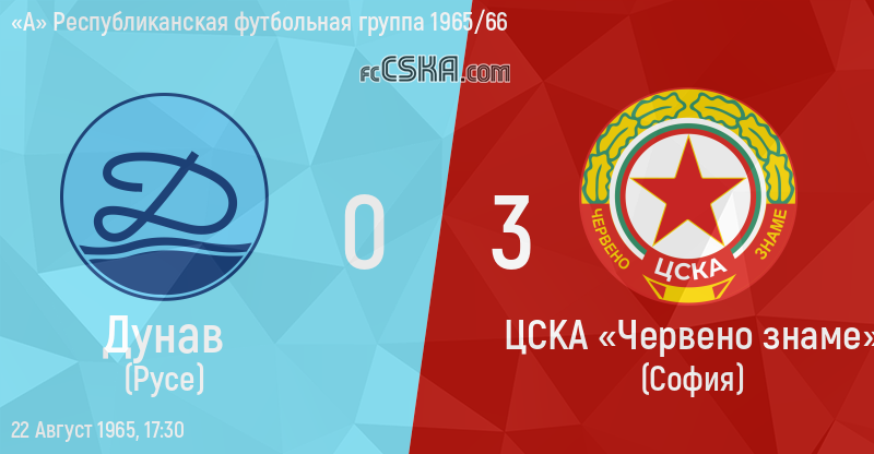 ЦСКА​ «Червено знаме» выиграл у Дунав (Русе) со счётом 0:3 в матче «А» Республиканская футбольная группа 1965/66 сыгранный 22 Август 1965 г. в 17:30 ч. на стадионе „Градски“ в Русе. за армейцев отличились Аспарух Никодимов (31′), Никола Цанев (58′) и Evden Kamenov (69′).
