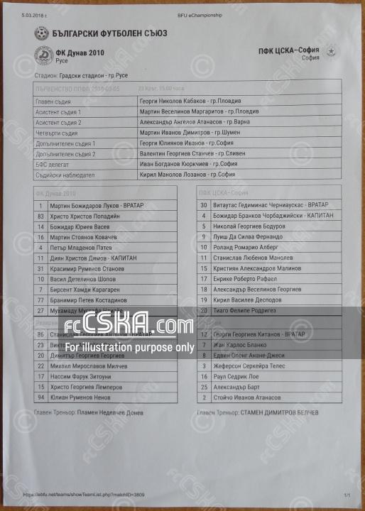 ЦСКА выиграл у Дунав 2010 (Русе) со счётом 0:2 в матче Первая профессиональная лига 2017/18 сыгранный 5 Март 2018 г. в 15:00 ч. на стадионе „Градски“ в Русе. за армейцев отличились Fernando Karanga (34′) и Эдвин Гьяси (92′).