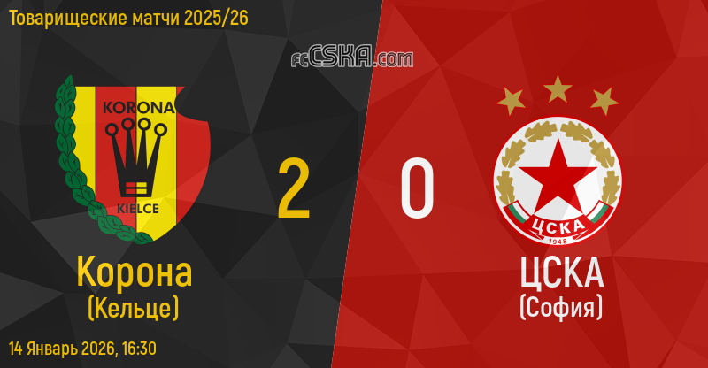 ЦСКА проиграла Корона (Кельце) со счётом 2:0 в матче Товарищеские матчи 2025/26 сыгранный 14 Январь 2026 г. в 16:30 ч. на стадионе „Титаник Лара 1“ в Лара.