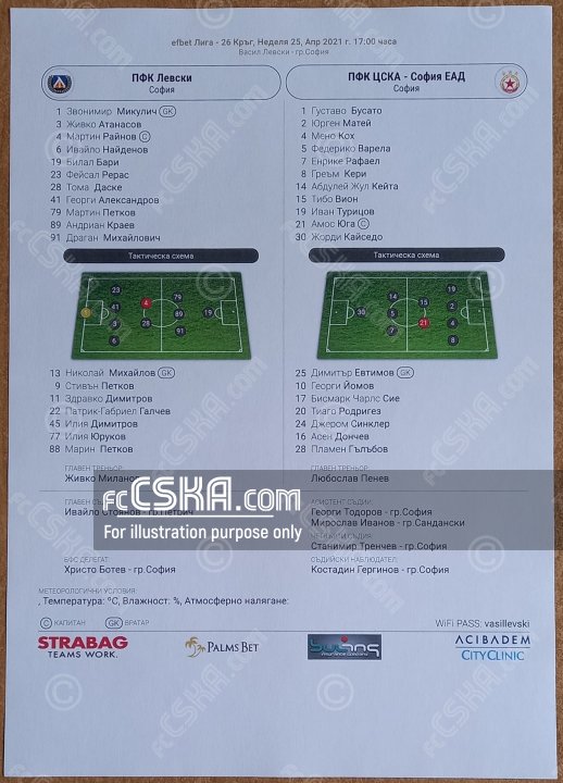 ЦСКА выиграл у Левски (София) со счётом 0:2 в матче Первая профессиональная лига 2020/21 сыгранный 25 Апрель 2021 г. в 17:00 ч. на стадионе „Васил Левски“ в София. за армейцев отличились Жюль Кейта (14′) и Хорди Кайседо (37′).