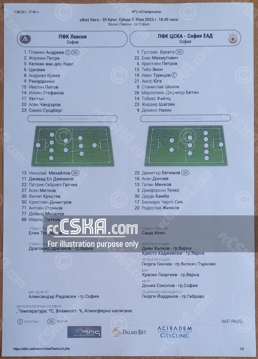ЦСКА выиграл у Левски (София) со счётом 0:2 в матче Первая профессиональная лига 2022/23 - первая шестёрка сыгранный 7 Июнь 2023 г. в 18:45 ч. на стадионе „Васил Левски“ в София. за армейцев отличились Тобиас Хайнц (35′) и Дюкенс Назон (61′).