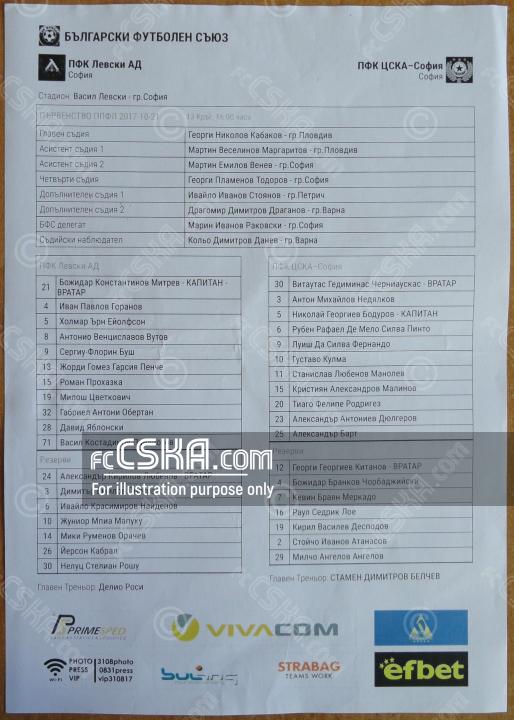 ЦСКА сыграла вничью с фк Левски (София) со счётом 2:2 в матче Первая профессиональная лига 2017/18 сыгранный 21 Октябрь 2017 г. в 16:00 ч. на стадионе „Васил Левски“ в София. за армейцев отличился Тиаго Родригес (12′ и 15′).