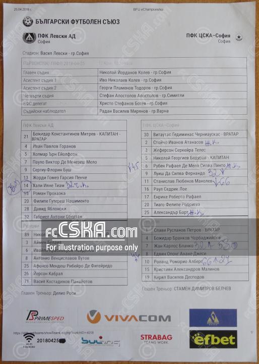 ЦСКА сыграла вничью с фк Левски (София) со счётом 2:2 в матче Кубок Болгарии 2017/18 сыгранный 25 Апрель 2018 г. в 18:30 ч. на стадионе „Васил Левски“ в София. за армейцев отличились Zhan Blanko (57′) и Roland Alberg (82′).