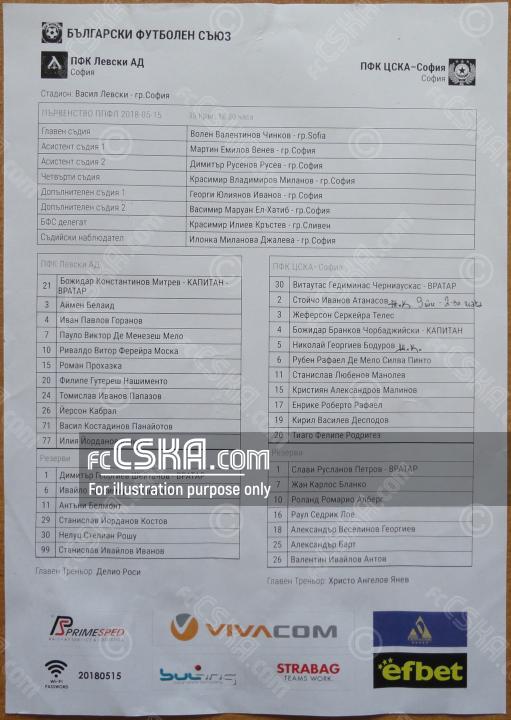 ЦСКА выиграл у Левски (София) со счётом 2:3 в матче Первая профессиональная лига 2017/18 - первая шестёрка сыгранный 15 Май 2018 г. в 18:30 ч. на стадионе „Васил Левски“ в София. за армейцев отличились Энрике (20′), Kristian Malinov (57′) и Ruben Pinto (90′).