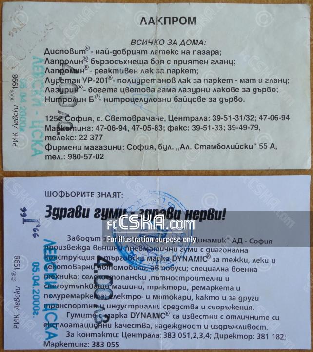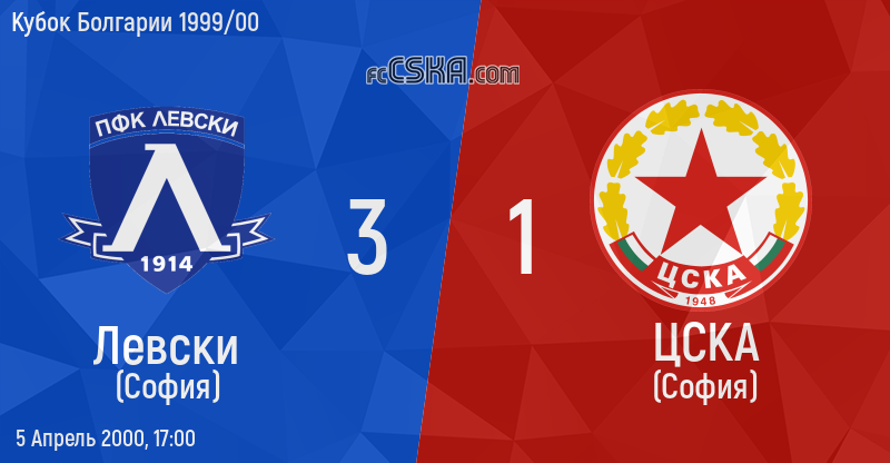 ЦСКА проиграла Левски (София) со счётом 3:1 в матче Кубок Болгарии 1999/00 сыгранный 5 Апрель 2000 г. в 17:00 ч. на стадионе „Георги Аспарухов“ в София. за армейцев отличился Димитр Иванов (86′ from penalty).