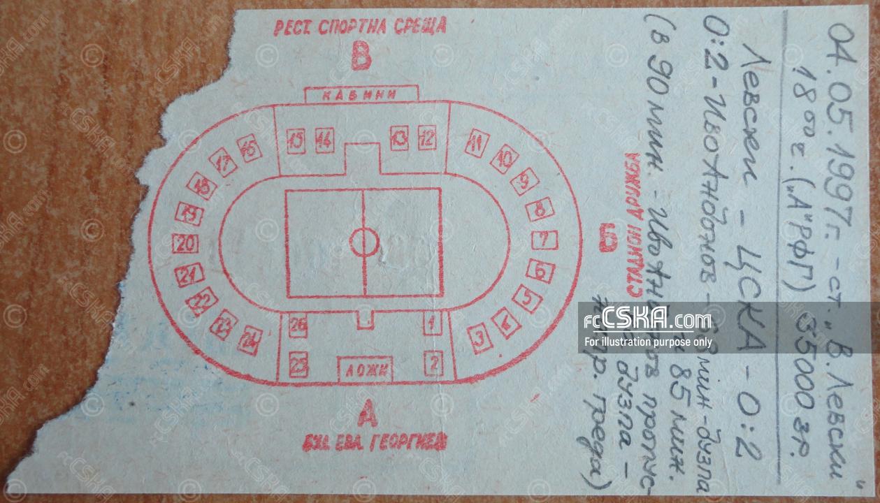 ЦСКА выиграл у Левски 1914 (София) со счётом 0:2 в матче «А» профессиональная футбольная группа 1996/97 сыгранный 4 Май 1997 г. в 18:00 ч. на стадионе „Васил Левски“ в София. за армейцев отличился Ivaylo Andonov (68′ from penalty и 85′).