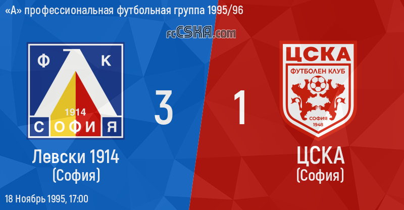 ЦСКА проиграла Левски 1914 (София) со счётом 3:1 в матче «А» профессиональная футбольная группа 1995/96 сыгранный 18 Ноябрь 1995 г. в 17:00 ч. на стадионе „Васил Левски“ в София. Автогол - home teams scored Валентин Дыртилов[1] (24′).