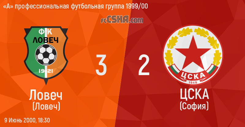ЦСКА​ проиграла Ловеч (Ловеч) со счётом 3:2 в матче «А» профессиональная футбольная группа 1999/00 сыгранный 9 Июнь 2000 г. в 18:30 ч. на стадионе „Градски“ в Ловеч. за армейцев отличился Стефан Джильо (61′ и 71′).