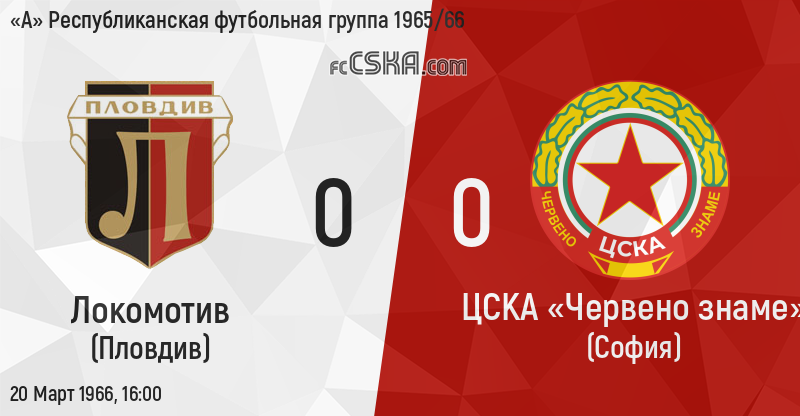 ЦСКА «Червено знаме» сыграла вничью с фк Локомотив (Пловдив) со счётом 0:0 в матче «А» Республиканская футбольная группа 1965/66 сыгранный 20 Март 1966 г. в 16:00 ч.