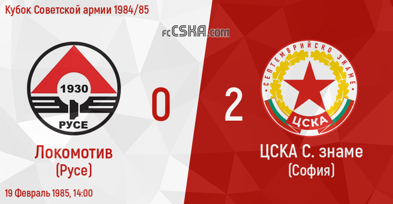 ЦСКА «Септемврийско знаме» выиграл у Локомотив (Русе) со счётом 0:2 в матче Кубок Советской армии 1984/85 сыгранный 19 Февраль 1985 г. в 14:00 ч. на стадионе „Градски“ в Русе. за армейцев отличились Стойчо Младенов (55′) и Georgi Slavkov (64′).