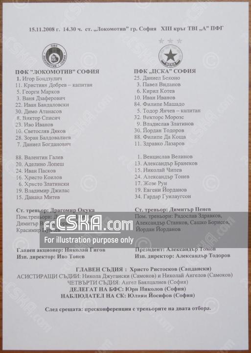 ЦСКА сыграла вничью с фк Локомотив (София) со счётом 1:1 в матче «А» футбольная группа 2008/09 сыгранный 15 Ноябрь 2008 г. в 14:30 ч. на стадионе „Локомотив“ в София. за армейцев отличился Zdravko Lazarov (45′).