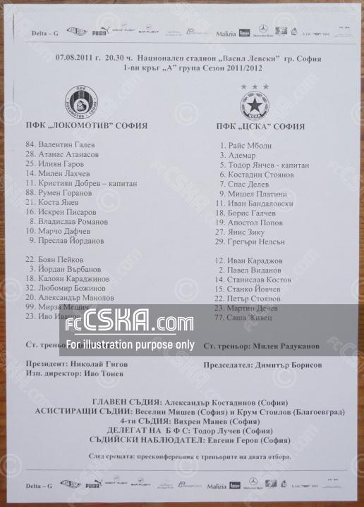 ЦСКА выиграл у Локомотив (София) со счётом 1:2 в матче «А» футбольная группа 2011/12 сыгранный 7 Август 2011 г. в 20:30 ч. на стадионе „Васил Левски“ в София. за армейцев отличились Spas Delev (3′) и Янис Зику (58′).
