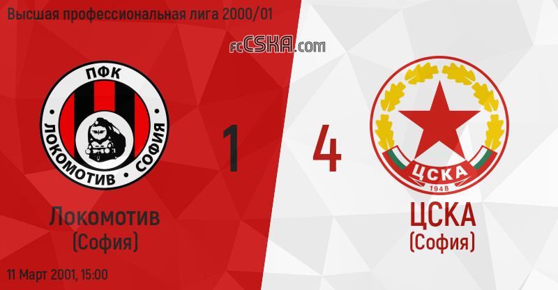 ЦСКА выиграл у Локомотив (София) со счётом 1:4 в матче Высшая профессиональная лига 2000/01 сыгранный 11 Март 2001 г. в 15:00 ч. на стадионе „Локомотив“ в София. за армейцев отличились Владимир Манчев (5′), Методи Деянов (32′), Асен Букарев (34′) и Мичо Враньеш (82′).