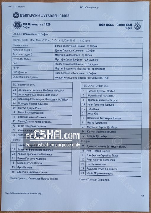 ЦСКА сыграла вничью с фк Локомотив 1929 (София) со счётом 1:1 в матче Первая профессиональная лига 2022/23 сыгранный 16 Июль 2022 г. в 18:30 ч. на стадионе „Локомотив“ в София. за армейцев отличился Браян Морено (90′).