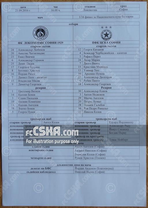 ЦСКА проиграла Локомотив 1929 (София) со счётом 2:1 в матче Кубок Болгарии 2016/17 сыгранный 21 Сентябрь 2016 г. в 16:00 ч. на стадионе „Локомотив“ в София. за армейцев отличился Rui Pedro (54′).