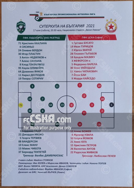 ЦСКА проиграла Лудогорец 1945 (Разград) со счётом 4:0 в матче Суперкубок Болгарии 2021 сыгранный 17 Июль 2021 г. в 20:30 ч. на стадионе „Васил Левски“ в София.