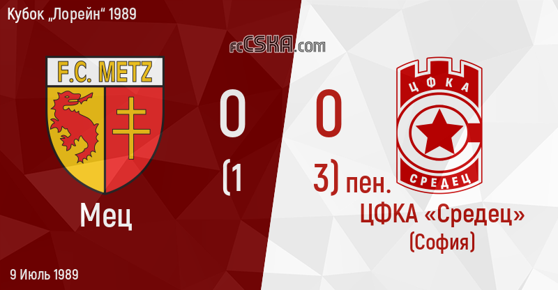 ЦФКА «Средец» сыграла вничью с фк Мец со счётом 0:0 в матче Кубок „Лорейн“ 1989 сыгранный 9 Июль 1989 г.