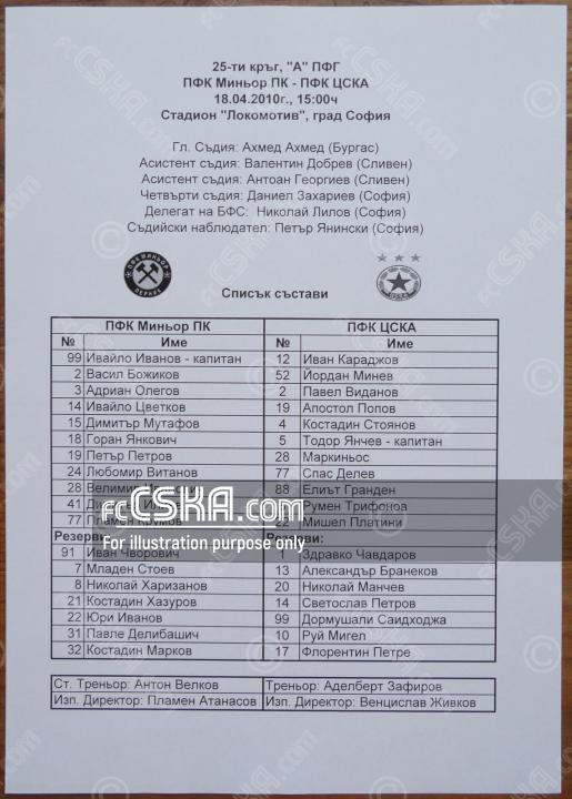 ЦСКА сыграла вничью с фк Миньор (Перник) со счётом 0:0 в матче „А“ футбольная группа 2009/10 сыгранный 18 Апрель 2010 г. в 15:00 ч. на стадионе „Локомотив“ в София.