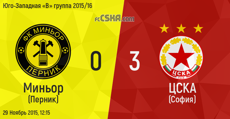 ЦСКА выиграл у Миньор (Перник) со счётом 0:3 в матче Юго-Западная «В» группа 2015/16 сыгранный 29 Ноябрь 2015 г. в 12:15 ч. на стадионе „Миньор“ в Перник. за армейцев отличились Nikolay Tsvetkov (27′), Preslav Yordanov (49′) и Momchil Tsvetanov (69′).
