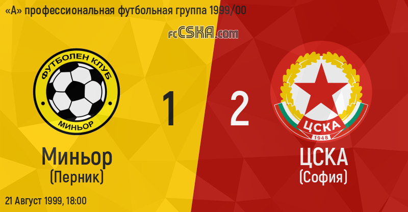 ЦСКА​ выиграл у Миньор (Перник) со счётом 1:2 в матче «А» профессиональная футбольная группа 1999/00 сыгранный 21 Август 1999 г. в 18:00 ч. на стадионе „Миньор“ в Перник. за армейцев отличился Румен Христов (76′ и 82′).