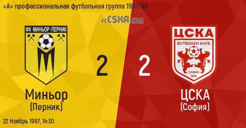 ЦСКА сыграла вничью с фк Миньор (Перник) со счётом 2:2 в матче «А» профессиональная футбольная группа 1997/98 сыгранный 22 Ноябрь 1997 г. в 14:30 ч. на стадионе „Миньор“ в Перник. за армейцев отличились Boncho Genchev (47′) и Иво Славчев (49′).