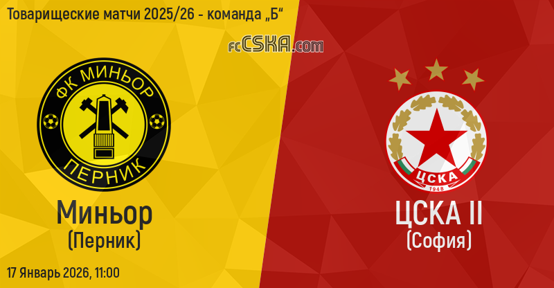 ЦСКА II​ будет играть с Миньор в матче Товарищеские матчи 2025/26 - команда „Б“ 17 Январь 2026 г. в 11:00 ч.