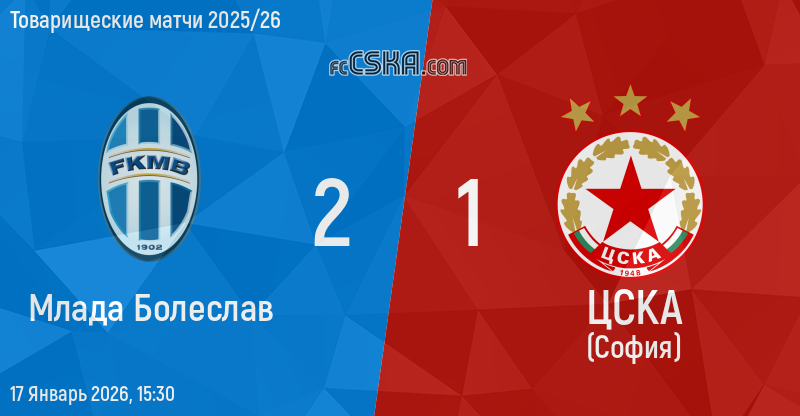 ЦСКА проиграла Млада Болеслав со счётом 2:1 в матче Товарищеские матчи 2025/26 сыгранный 17 Январь 2026 г. в 15:30 ч. на стадионе „Корнелия“ в Белек. за армейцев отличился Мохамед Брахими (91′ from penalty).