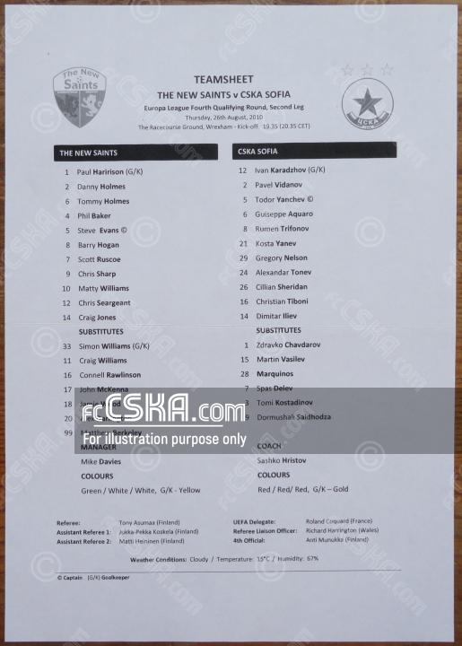 ЦСКА сыграла вничью с фк Нью-Сейнтс со счётом 2:2 в матче сыгранный 26 Август 2010 г. в 21:35 ч. за армейцев отличились Dzhuzepe Akuaro (11′) и Kristian Tiboni (80′).