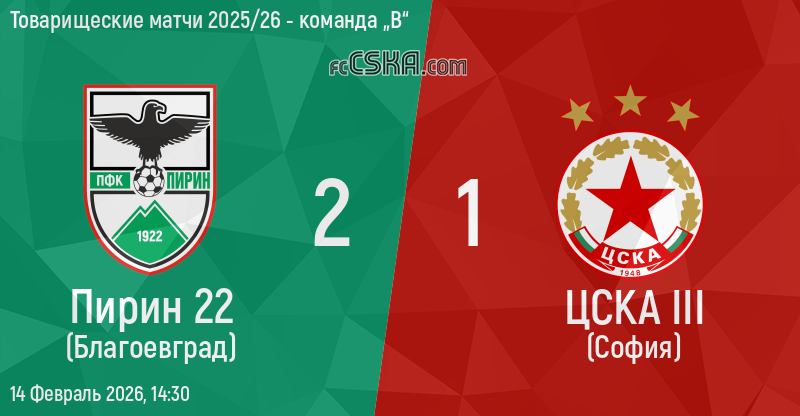 ЦСКА III​ проиграла Пирин 22 (Благоевград) со счётом 2:1 в матче Товарищеские матчи 2025/26 - команда „В“ сыгранный 14 Февраль 2026 г. в 14:30 ч.