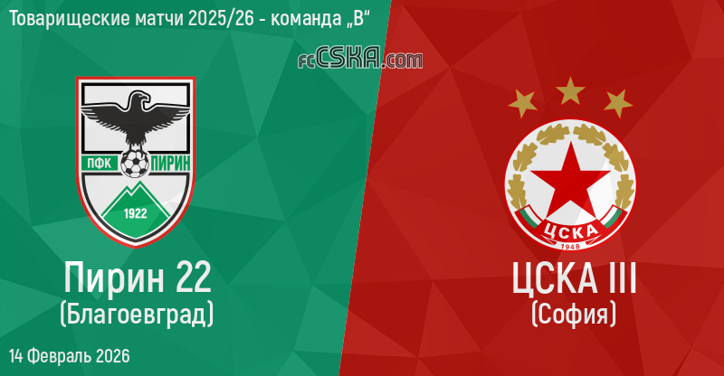 ЦСКА III будет играть с Пирин в матче Товарищеские матчи 2025/26 - команда „В“ 14 Февраль 2026 г.