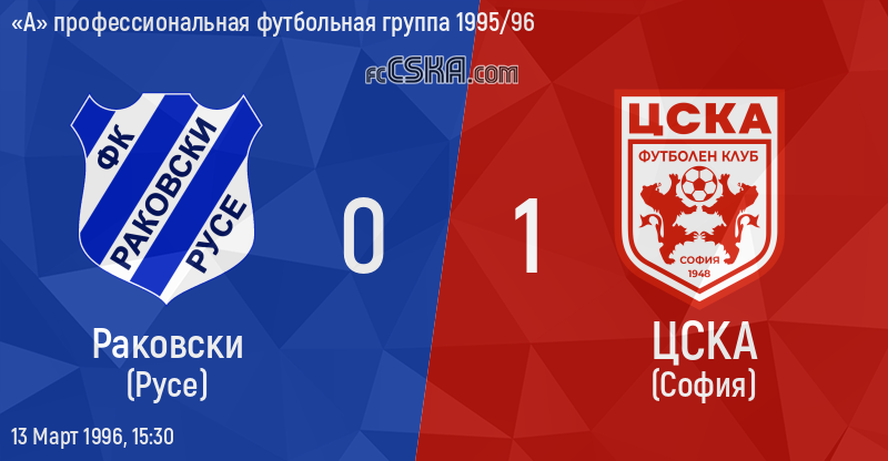ЦСКА выиграл у Раковски (Русе) со счётом 0:1 в матче «А» профессиональная футбольная группа 1995/96 сыгранный 13 Март 1996 г. в 15:30 ч. за армейцев отличился Georgi K. Georgiev (30′).