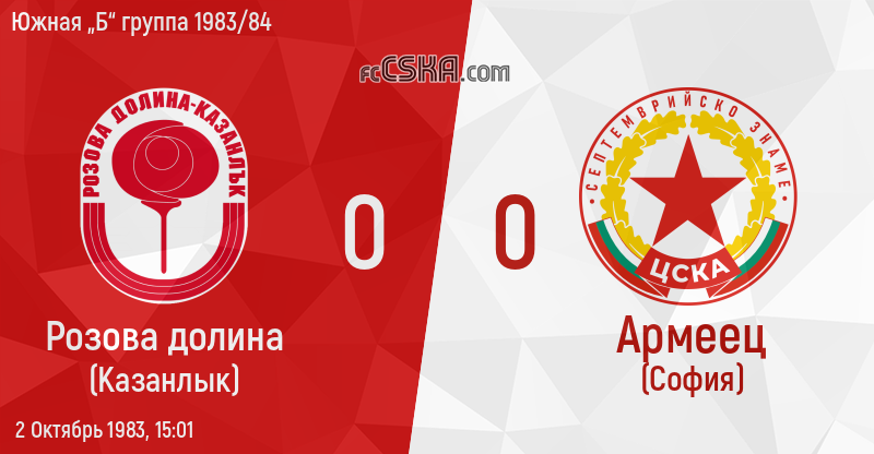 Армеец Сф сыграла вничью с фк Розова долина (Казанлык) со счётом 0:0 в матче Южная „Б“ группа 1983/84 сыгранный 2 Октябрь 1983 г. в 15:01 ч.